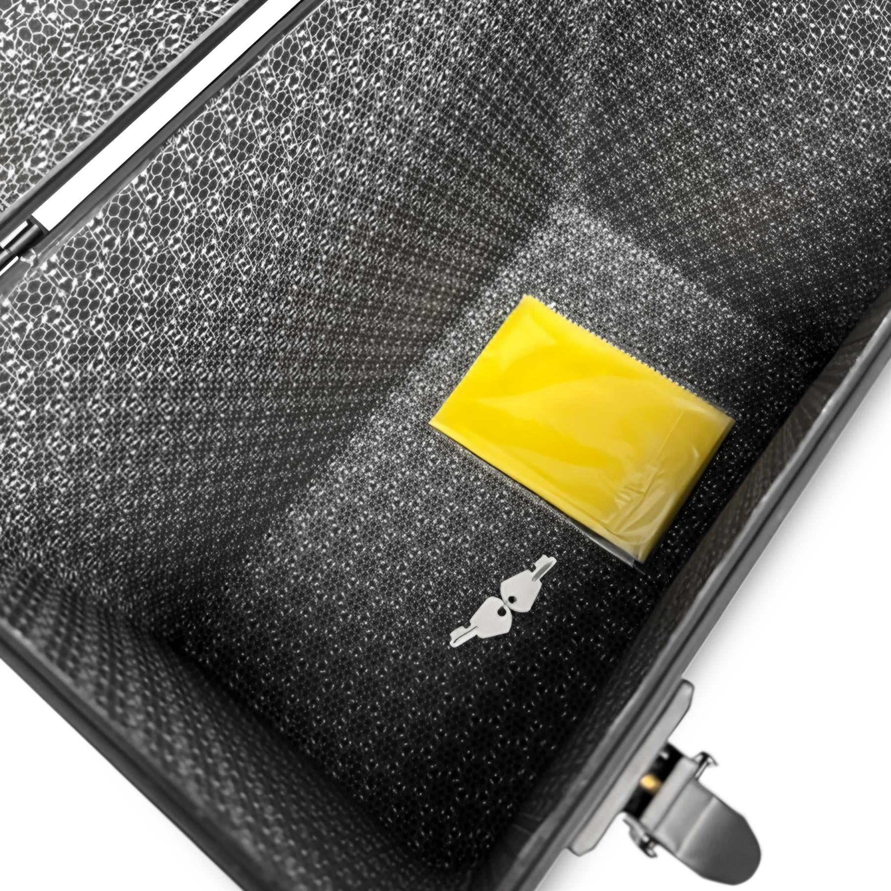 This superb looking vinyl record storage case comes in a black finish with black colour edge protectors, twin lockable catches with keys included, is fully lined and includes not just a lifetime warranty but a free vinyl record cleaning cloth too!