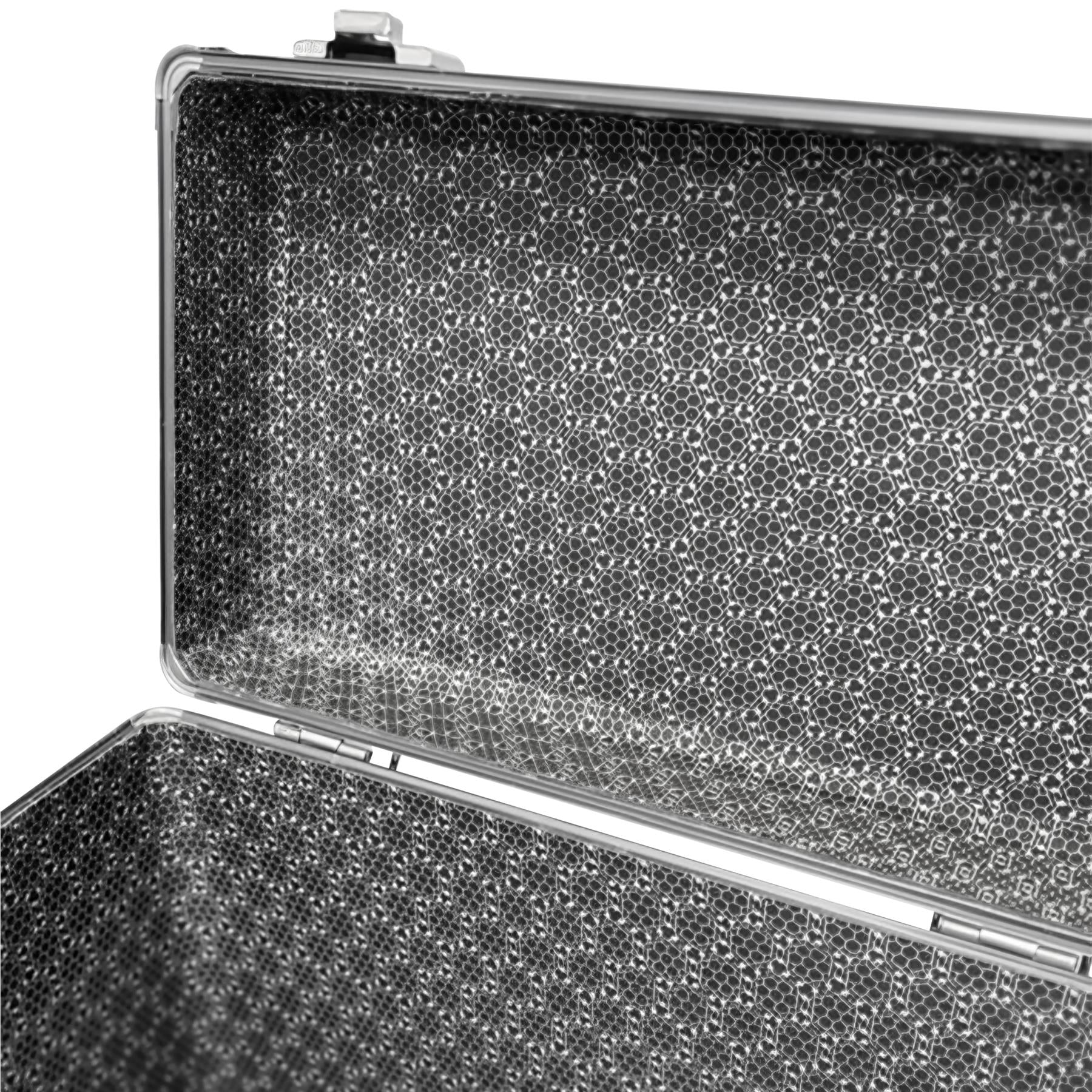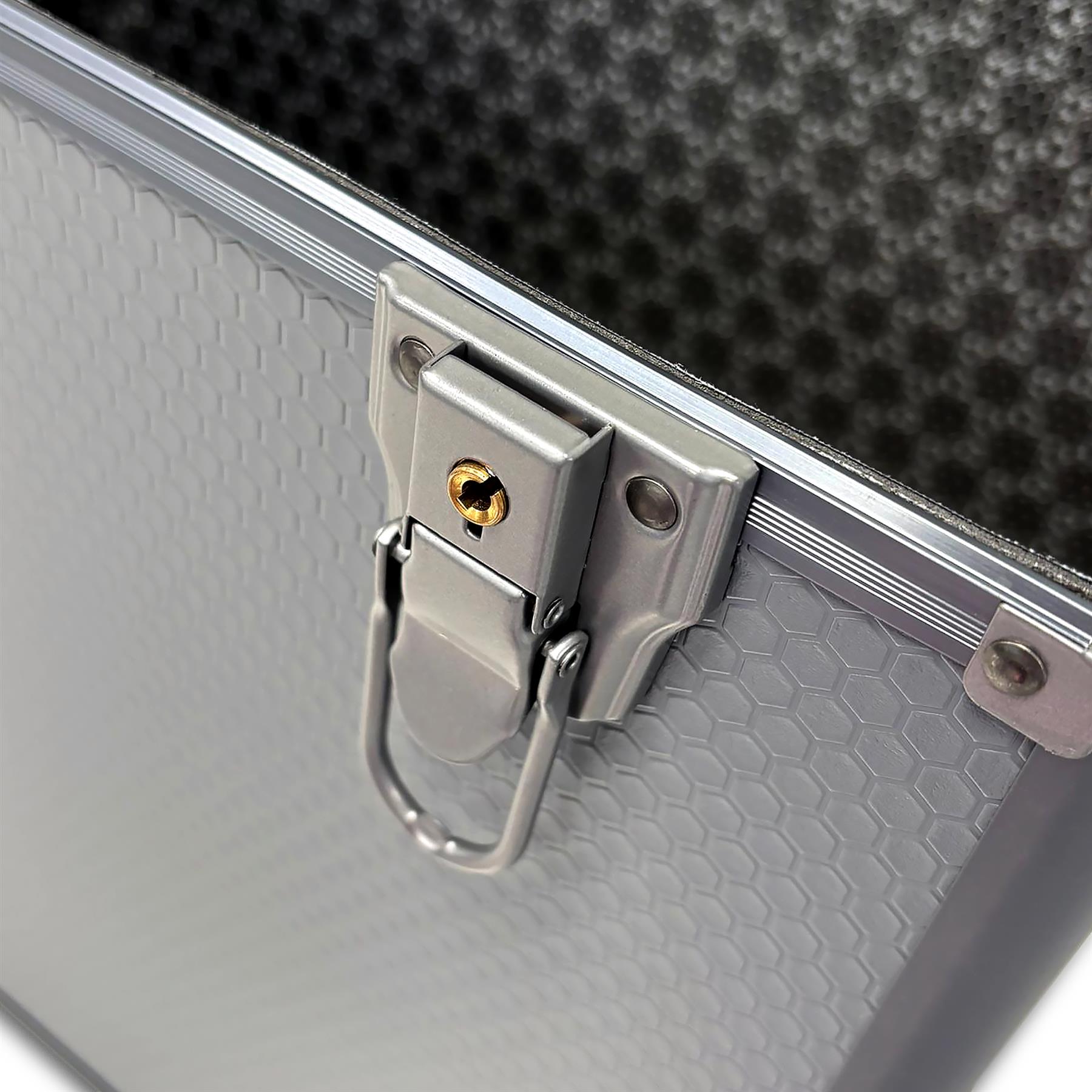 This superb looking vinyl record storage case comes in a grey finish with grey colour edge protectors, twin lockable catches with keys included, is fully lined and includes not just a lifetime warranty but a free vinyl record cleaning cloth too!